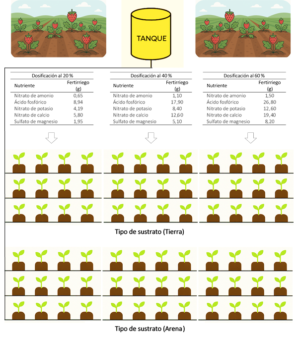 40 % y 60 %) y dos tipos de sustrato (tierra agrícola y arena). Las