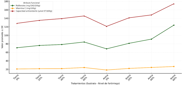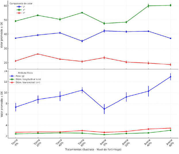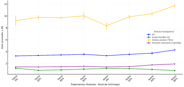 significativas (p < 0,05) entre tratamientos, destacando el fertirriego al 60 % en sustrato arenoso, que promovió una